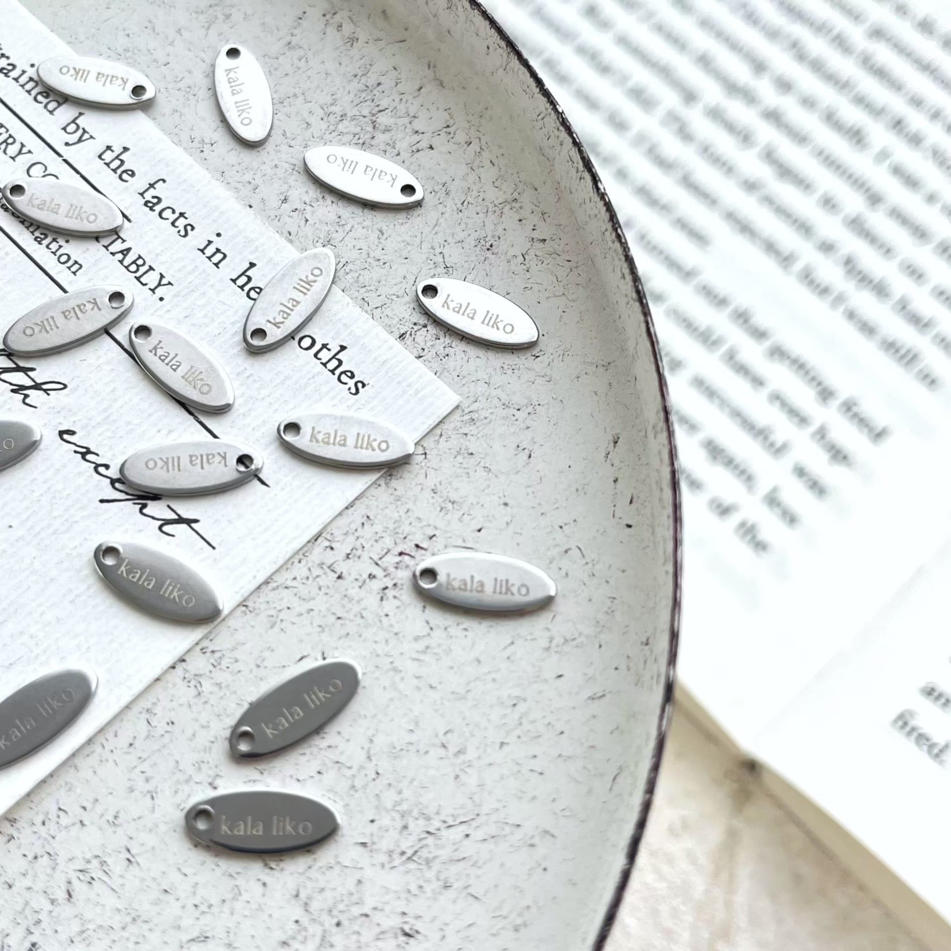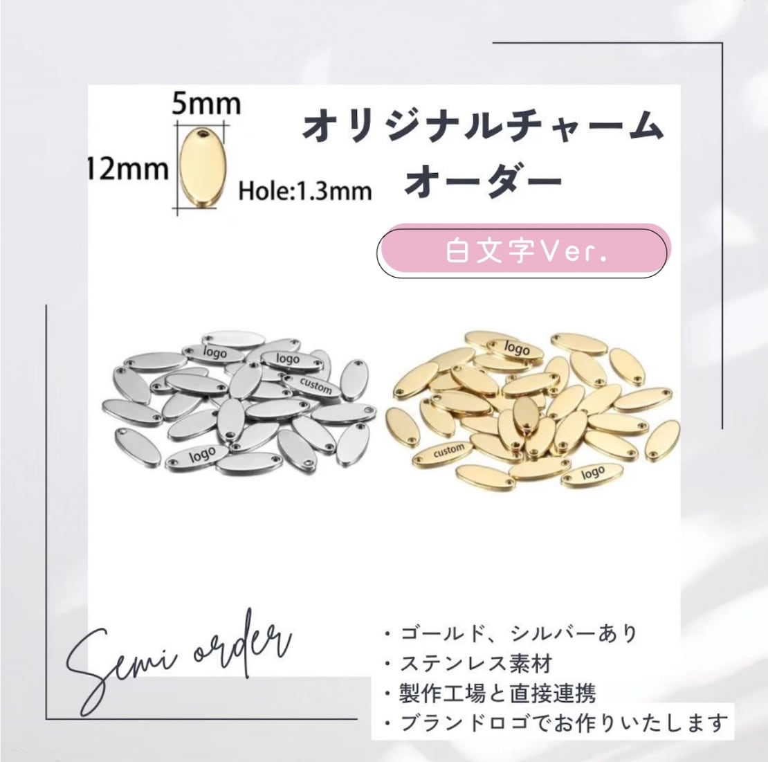 ロゴ入りステンレス製オーバル型チャーム12×5mm【白Ver. 】の