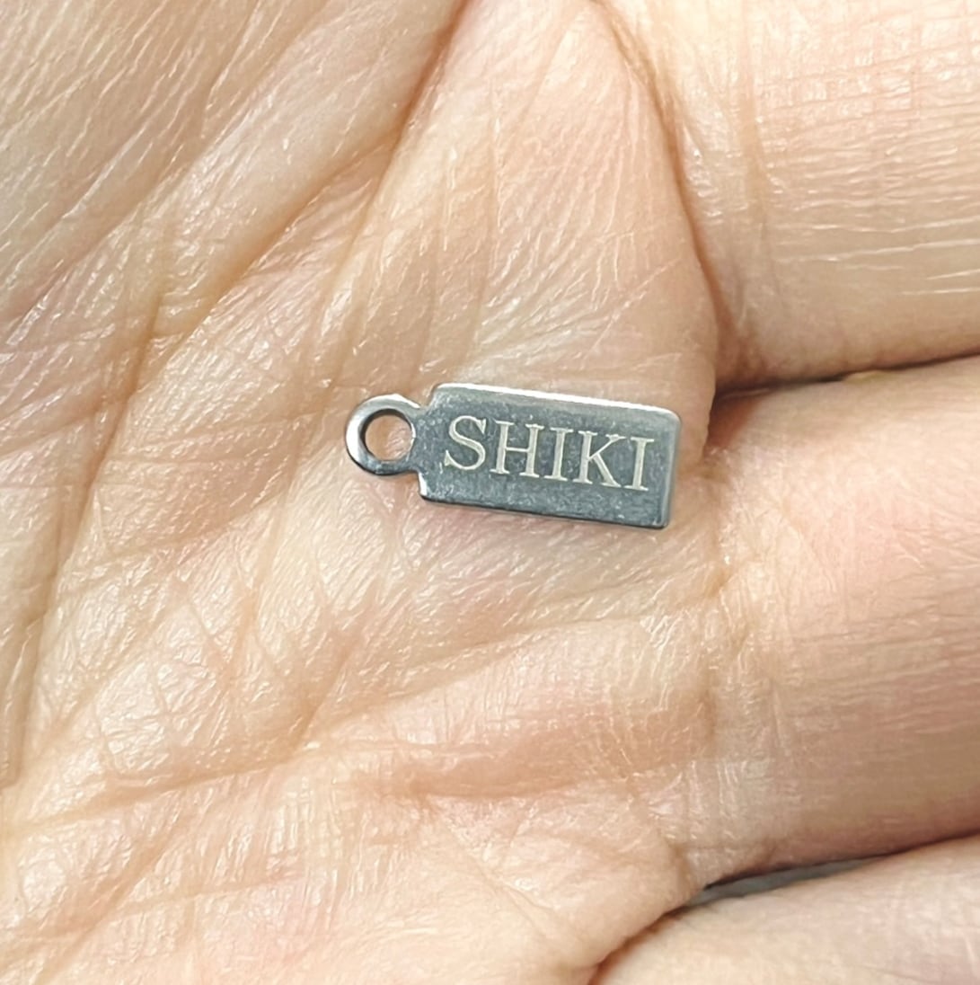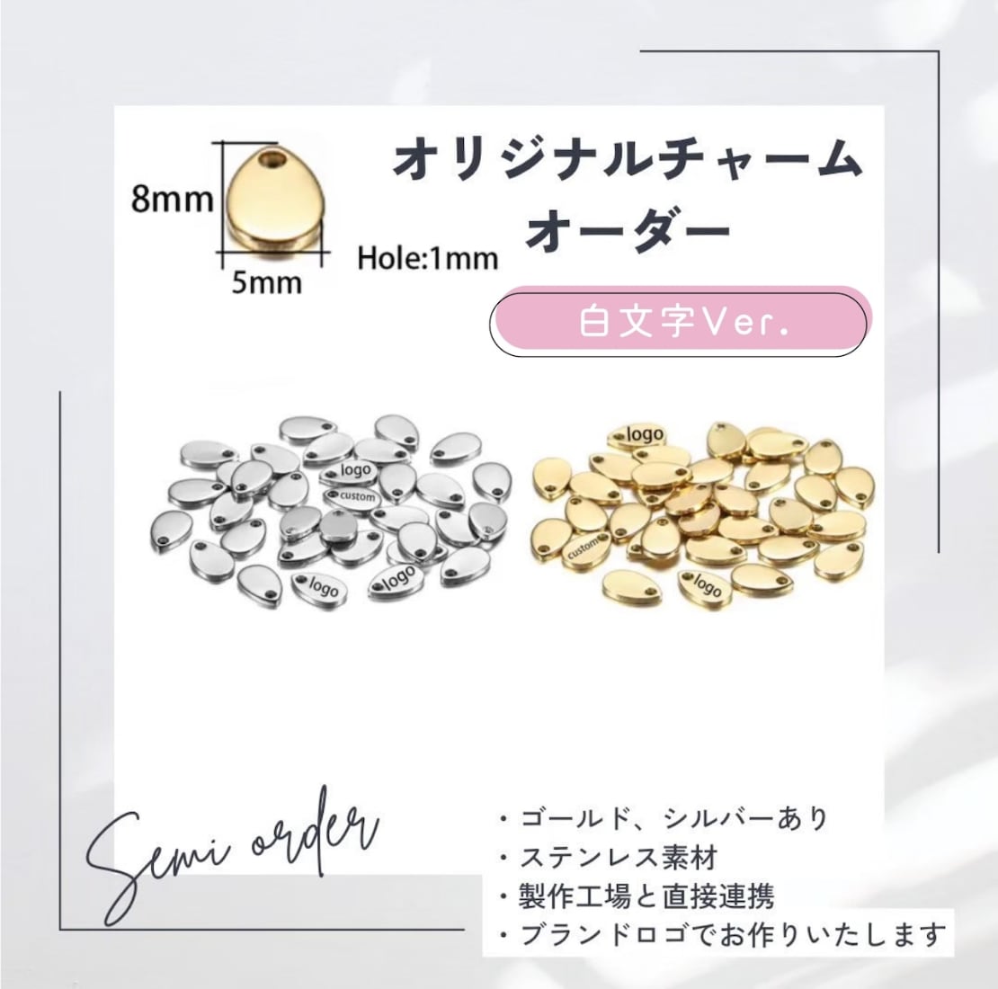 ロゴ入りステンレス製ドロップ型チャーム8×5mm【白Ver. 】の